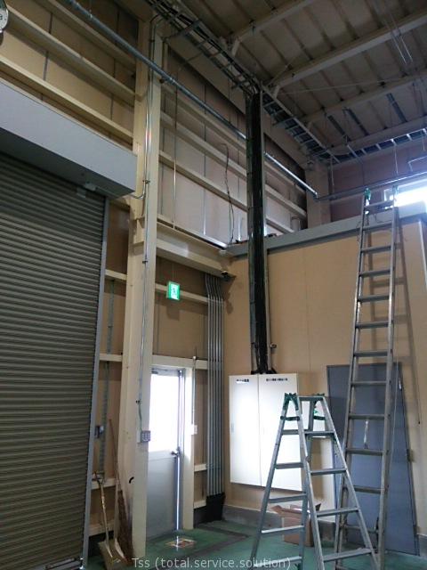 - 工場、電灯盤より幹線をケーブルラック上へ引っ張ります