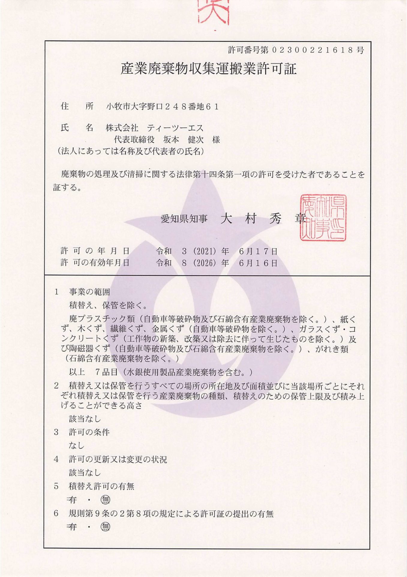 | 産業廃棄物収集運搬業許可 愛知県 許可番号 02300221618 岐阜県 許可番号 02100221618 |