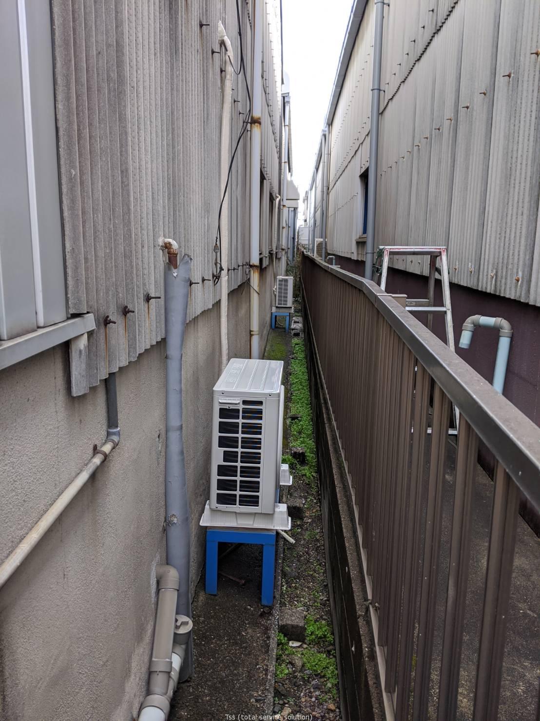 重い室外機が2階の壁、配管が小屋根を通る面倒な作業でも
